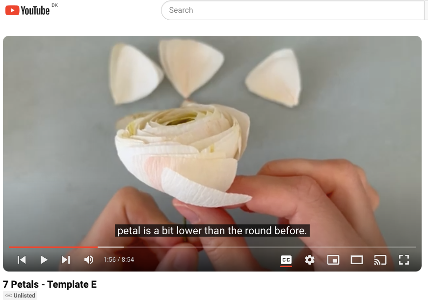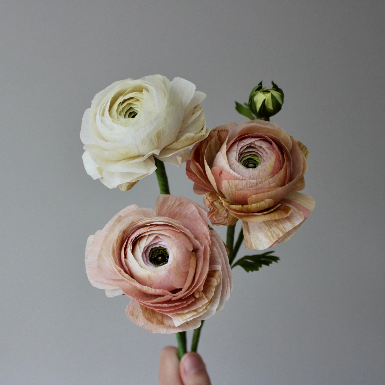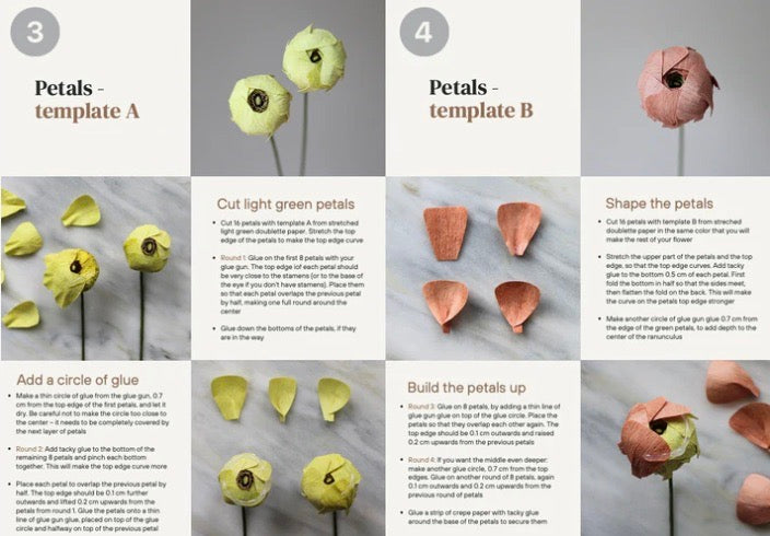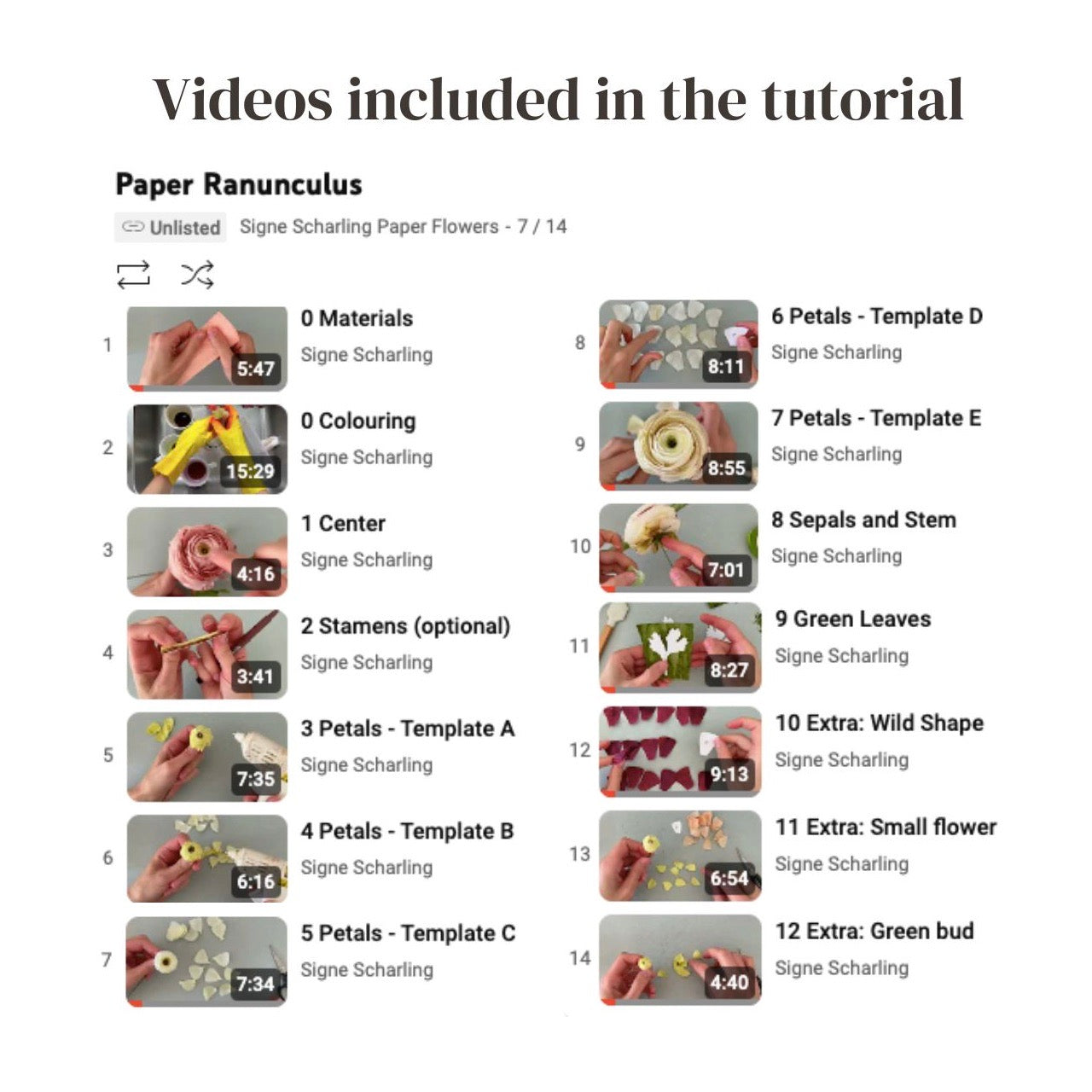 Make beautiful ranunculus out of crepe paper! With this tutorial and video course you will learn how to get the round shape of the ranunculus just right. You also learn to make small ranunculus flowers, green buds, leaves - and how to colour the crepe paper in all the colours seen in the pictures.