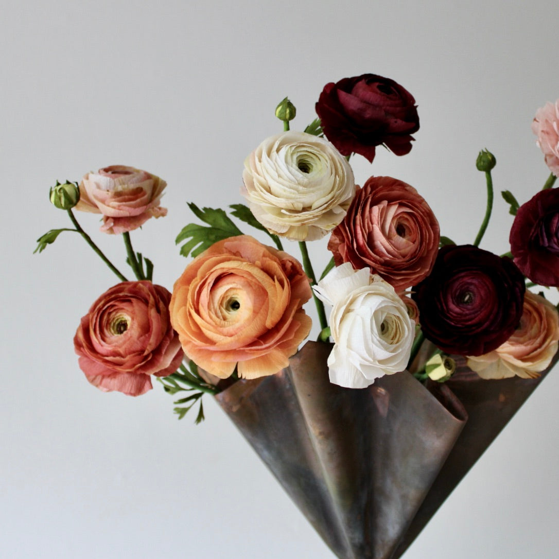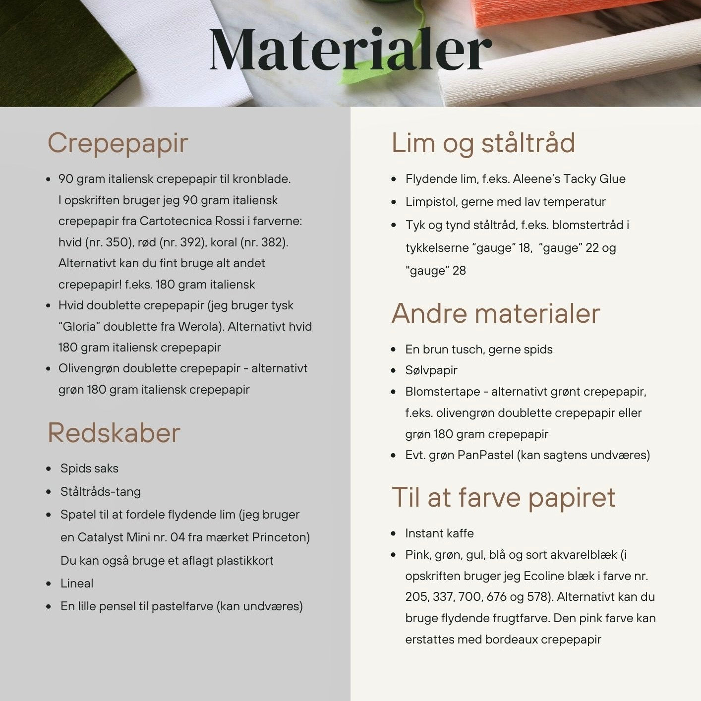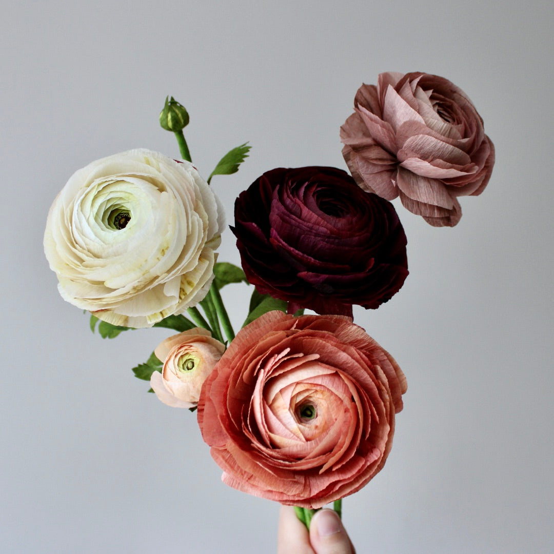 Make beautiful ranunculus out of crepe paper! With this tutorial and video course you will learn how to get the round shape of the ranunculus just right. You also learn to make small ranunculus flowers, green buds, leaves - and how to colour the crepe paper in all the colours seen in the pictures.